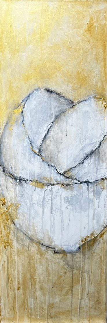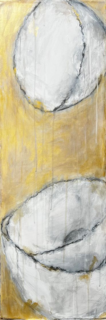 2 works. 12” x 24”. Falling Bowls. Acrylic, charcoal, crayon and gold paint on paper on canvas