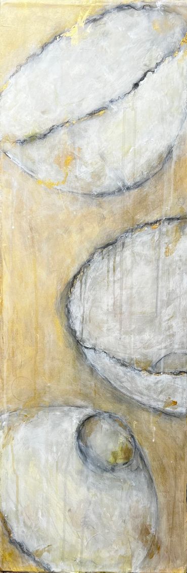 3 Works. 15” x 30”. FLoating Bowls. Acrylic, charcoal, crayon and gold paint on paper on canvas